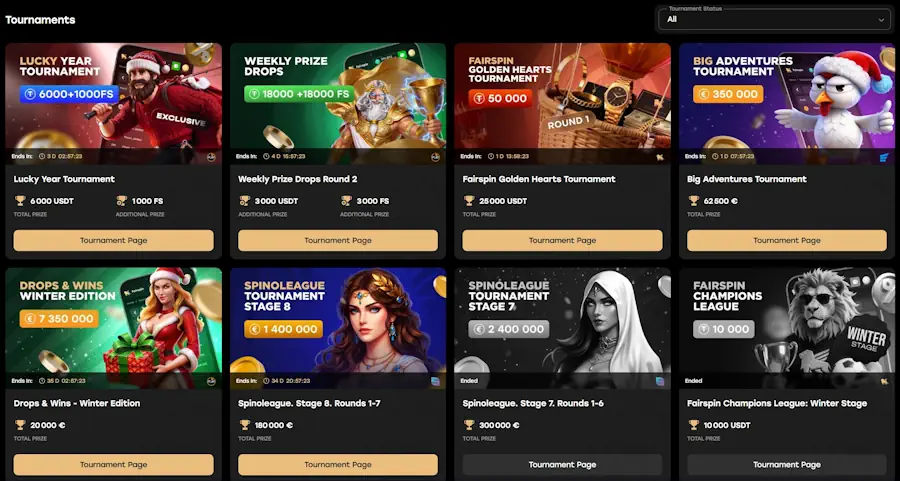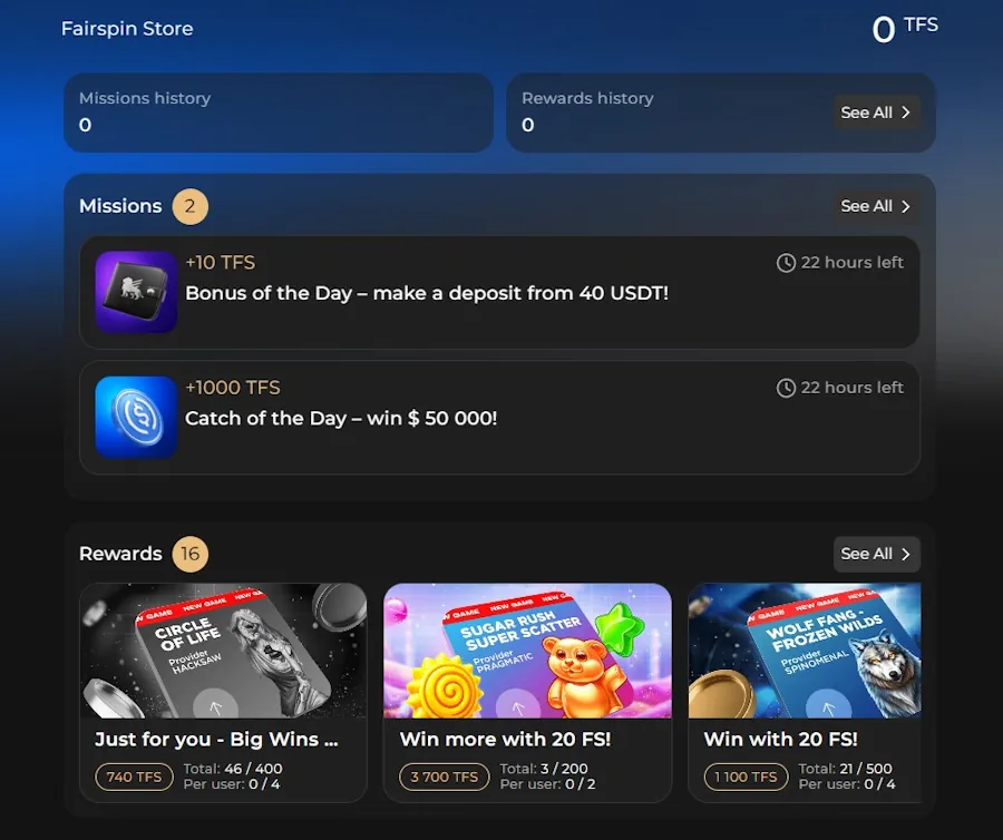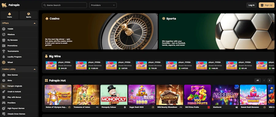 Fairspin is a blockchain-based online casino offering transparent gambling through cryptographic verification. Players can verify all game outcomes using Trueplay Explorer. The platform features 7,500+ games, cryptocurrency payments, and the innovative TFS token reward system.